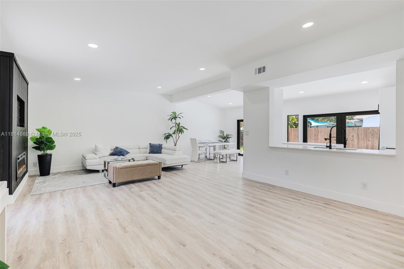Step inside to an open-concept layout that seamlessly connects the living, dining, and kitchen areas—all with inviting views of the backyard and pool.